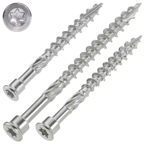 Durch die martensitische und korrosionsbeständige Edelstahllegierung erreicht diese hochwertige Terrassenbauschraube ein bis zu 60 % höheres Bruchdrehmoment als A2 oder A4 Terrassenschrauben.