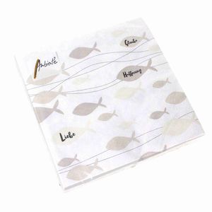 Elegante hochwertige Papier-Serviette mit schönen christlichen Fisch Symbolen und den Worten Glaube, Liebe, Hoffnung auf weißem Hintergrund.