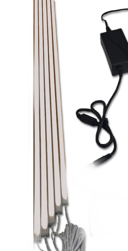 Moderne Akustik Panels LED Beleuchtung mit 5 x 50cm Länge in Kunststoff Schiene schwarz lichtdurchlässig und einsteckbar. Im aus geschalteten Zustand passt sich das schwarz der Paneele fast an. Ein Kabel mit Stecker an jeder Leuchte für den Anschluss an den mitgelieferten Verteiler. Lieferung inklusive Netzteil und passendem Kabel wird mitgeliefert. Für größere LED Anlagen mit mehr Leuchten fragen Sie die bei uns an. Wir errechnen wir für Sie das passende Netzteil in der richtigen Größe. Dazu benötigen wir nur die Länge und die Anzahl der LED Leuchten.
