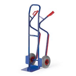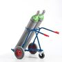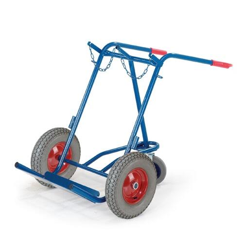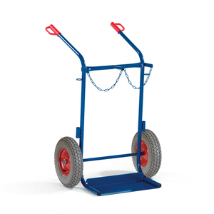 Die Stahlflaschenkarre mit Stützrad ist aus einer stabil geschweißten Rundrohr-Stahlkonstruktion. Die Stahlflaschenkarre ist in RAL 5010 (enzianblau) pulverbeschichtet und hat dadurch eine weitgehend kratz- und stoßfeste Oberfläche. Das Stützrad ist fest an der Stahlflaschenkarre angebracht und ist nicht einklappbar. Die beiden Handgriffe sind mit Sicherheitsbügel versehen. Unentbehrlich für das Schweißen im mobilen Einsatz. Für das sichere und ergonomische transportieren von 50 ltr. Stahlflaschen. Die Stahlflaschenkarre kann wahlweise mit Vollgummi- oder Lufträder ( 400x80 mm bzw. 400x100 mm) geliefert werden. Das Stützrad ist ein Lenkrad mit Feststeller (gemäß Sicherheitsnorm DIN EN 1757-3) mit Vollgummibereifung 200 mm und Kunststofffelge.